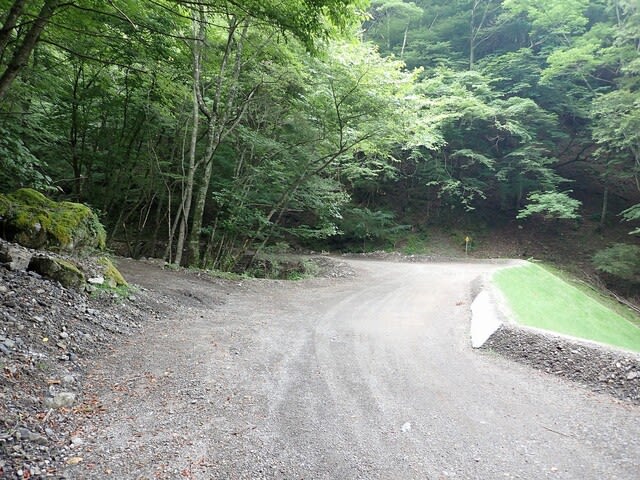 林道の崩落個所はきれいに復旧されていた。崩落個所までは復旧工事で工事車両が通って