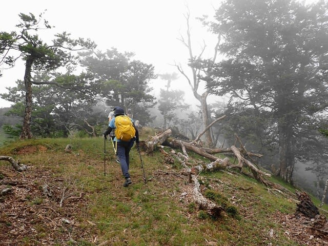 木々がまばらで晴れていたら日差しが照り付ける山頂までの稜線も、今日は時々ガスが