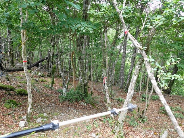 今日はここからさらに西へと下って行く。地形図で支尾根が分かれた場所では、傾いた境