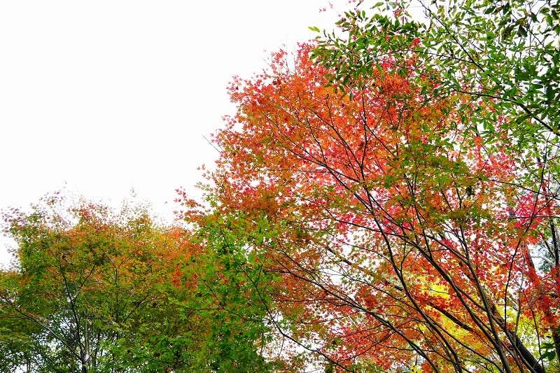 赤からオレンジ、そして黄色へのグラデーションの木。また赤一色に染まる木。緑の葉が混ざっているのもなか