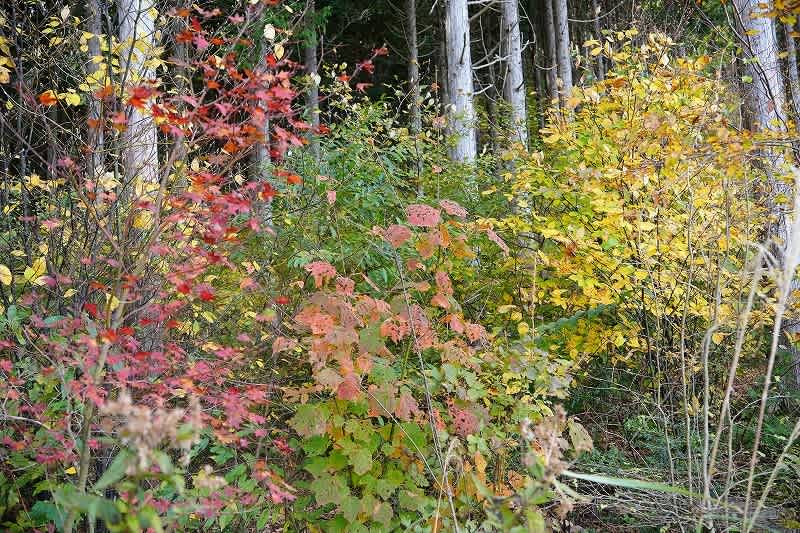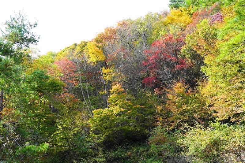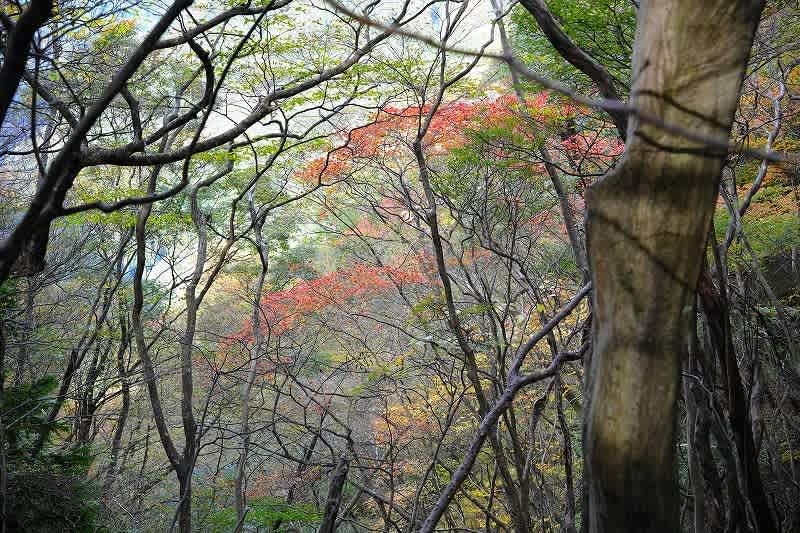 次第に道の左側は植林地から自然林になり、紅葉のグラデーションにハッと目を奪われる。